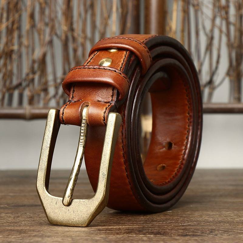 Dieser Wendegürtel ist handgefertigt aus 5,5 mm extra dickem, pflanzlich gegerbtem Leder, 2,16 Zoll breit, mit flacher Kante und Einzelnaht, was ihm ein edles und elegantes Aussehen verleiht. Die hochwertige Schnalle aus massivem Messing mit Einzeldorndesign ergänzt die Robustheit des Gürtels und bietet gleichzeitig einen sicheren und stilvollen Verschluss.